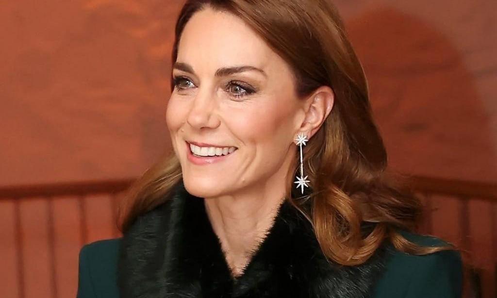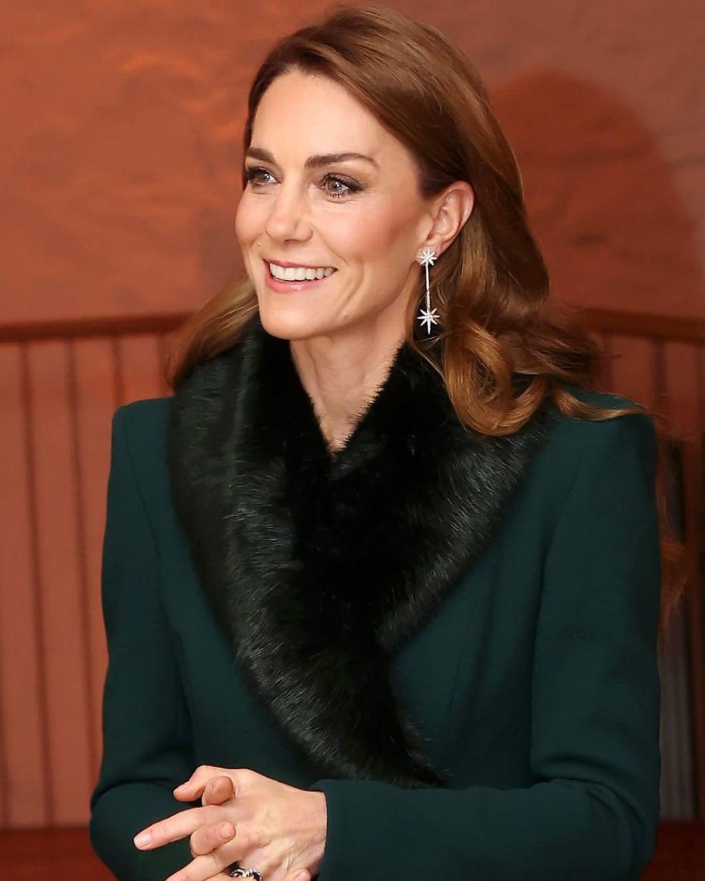 Кейт была на богослужении в приталенном темно-зеленом платье-пальто Catherine Walker с воротником из искусственного меха и в черных сапогах Ralph Lauren. Будущая королева дополнила вечерний образ серьгами-подвесками Robinson Pelham в форме звезд, инкрустированных бриллиантами.