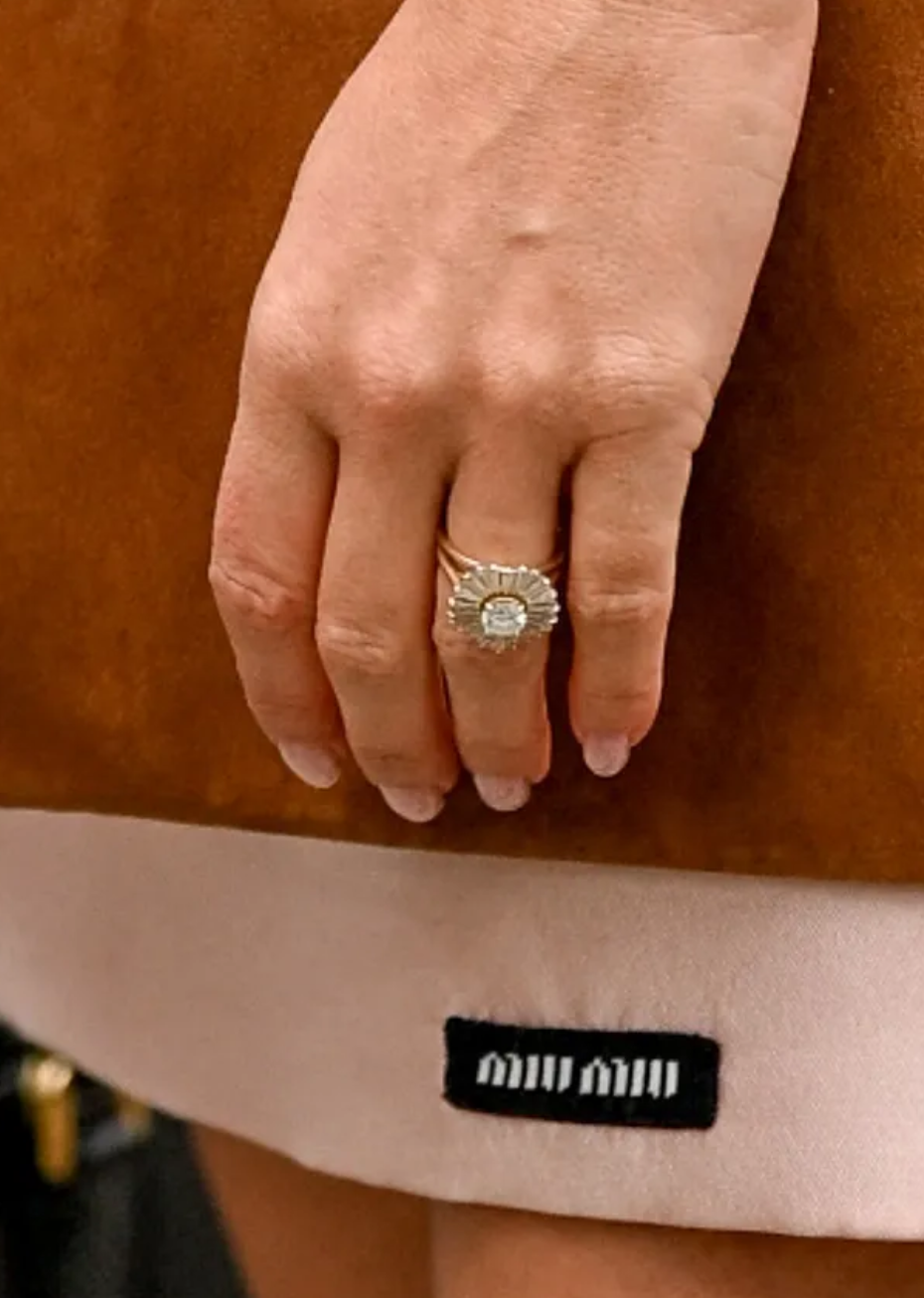 Актриса не скрывала украшение от фотографов. Она то и дело поправляла рукой волосы и активно жестикулировала. Кольцо было выполнено в винтажном стиле, который сейчас популярен у зарубежных звезд. Его украшал крупный бриллиант в центре, золотые «лепестки» и россыпь мелких камней.