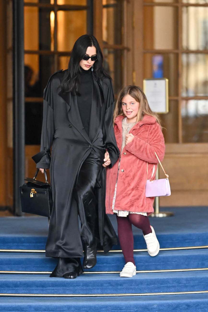 Лея выбрала более воздушный и милый образ. Она надела бежевый джемпер и белую юбку с пестрым цветочным принтом, а также бордовые колготки и белые кроссовки. Аутфит завершили цепочка с кулоном, розовая шубка из искусственного меха цвета с золотыми пуговицами и бледно-розовая сумочка. Одежда девочки контрастировала с монохромным ансамблем ее матери.