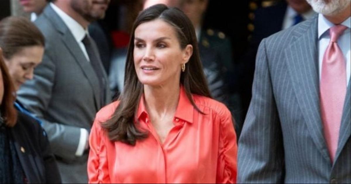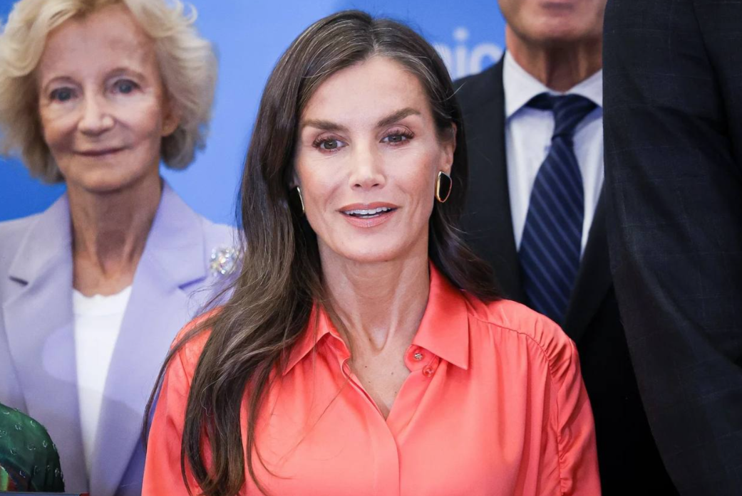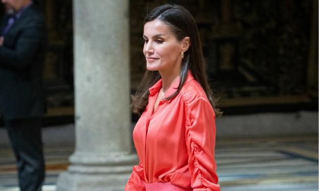 Супруга короля Филиппа VI надела коралловую шелковую блузку с оборкой на рукавах и стильную кожаную юбку с разрезом бренда Hugo Boss. Завершили аутфит нюдовые слингбэки на невысоком каблуке, а также золотые серьги-клипсы и макияж в розовых оттенках. Волосы королева оставила распущенными.