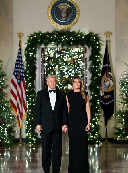 В этот день атмосфера в резиденции президента была по-настоящему волшебная. Супруги сидели у огромной елки, украшенной золотыми и красными шарами. Мелания выглядела великолепно в строгом черном платье Valentino с кружевными вставками на рукавах. Свой элегантный образ она дополнила туфлями Christian Louboutin на высоких шпильках. Избранница Трампа сделала макияж в теплых оттенках и безупречную волнистую укладку.