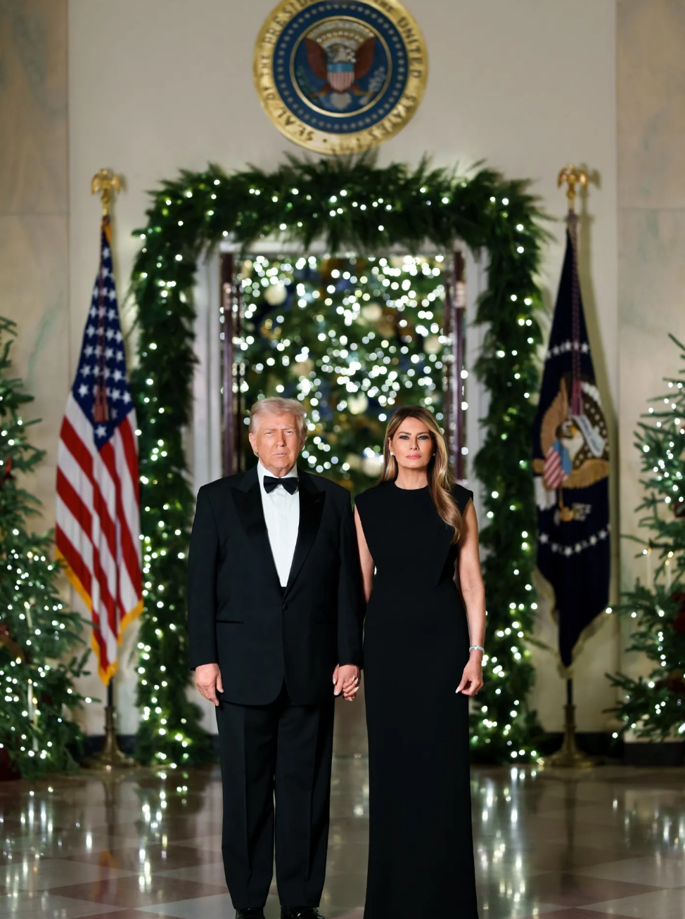 Для съемки Мелания выбрала закрытое черное платье в пол, дополнив образ жемчужными серьгами и бриллиантовым браслетом, в то время как Дональд был в классическом черном смокинге с галстуком-бабочкой. При этом под публикацией комментаторы отметили, что выражения лиц пары явно не передают праздничного настроения, да и в целом выглядят они так, «будто готовятся к похоронам». «Чертовски депрессивно», — посетовали интернет-пользователи.