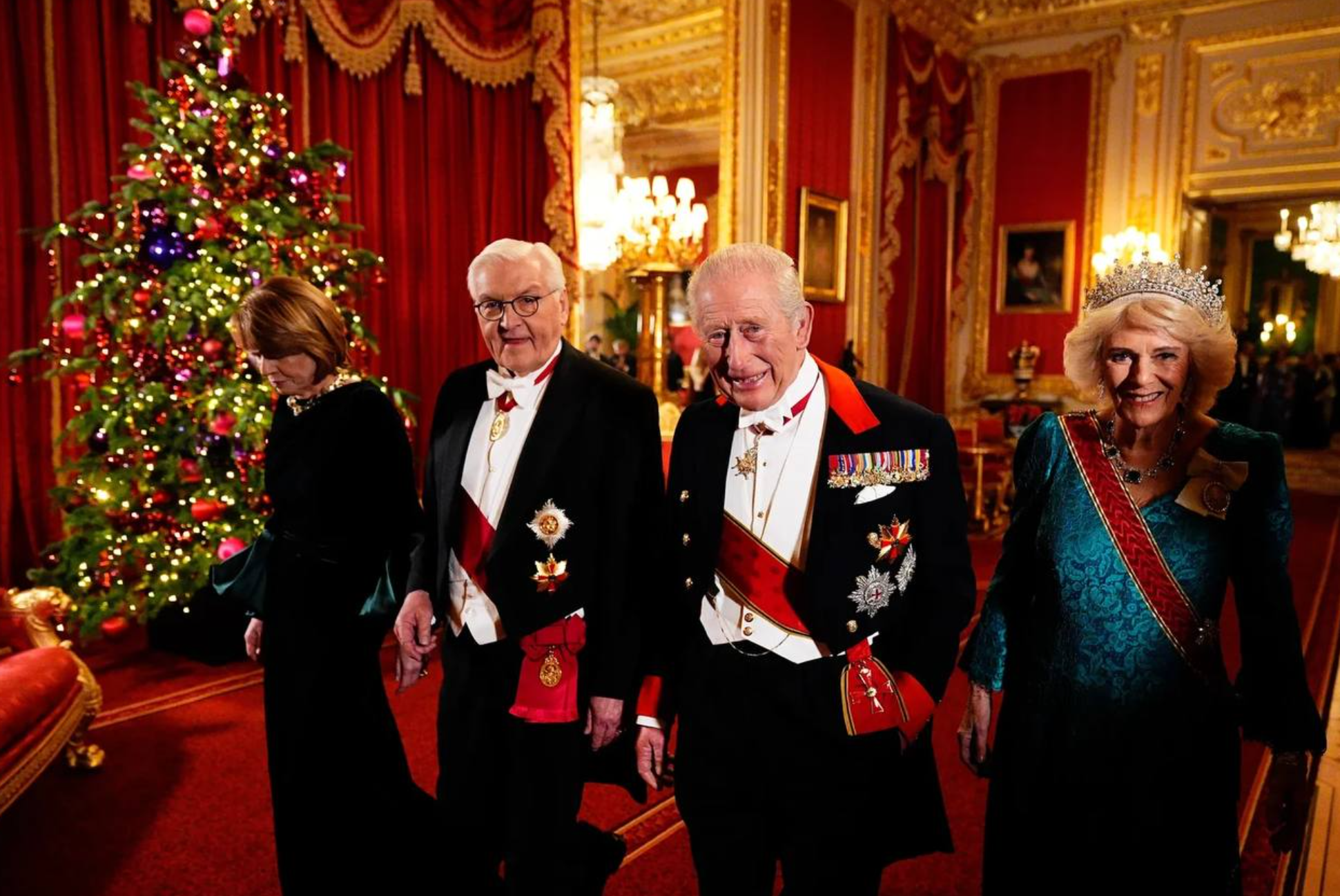 Виндзорский замок вновь засиял праздничными огнями. В этот раз королевская семья Великобритании устроила здесь званый ужин в честь первого за 27 лет государственного визита германских властей. Почетными гостями на банкете стали президент страны Франк-Вальтер Штайнмайер с женой Эльке Бюденбендер. Пару приветствовали король Карл III с женой Камиллой.
