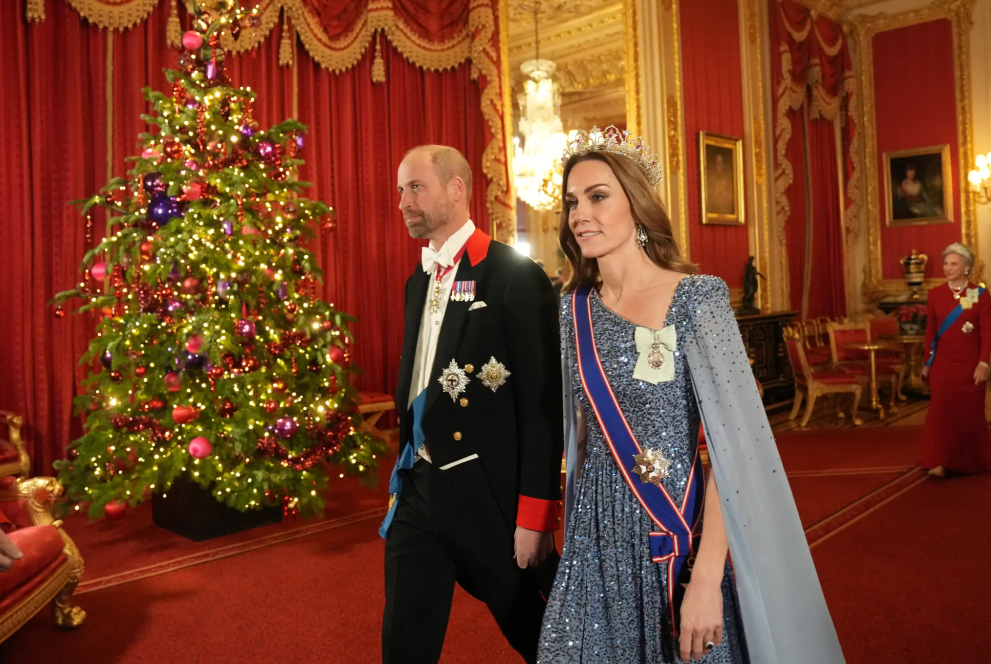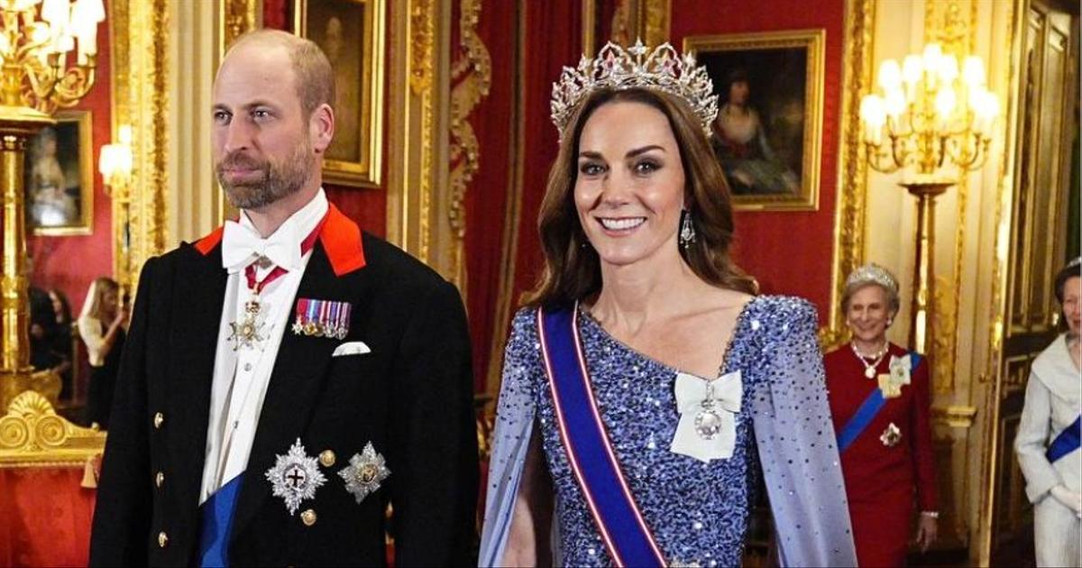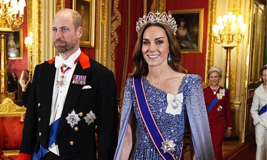 На торжественном банкете были также 43-летние принц Уильям и Кейт Миддлтон. Как всегда, принцесса выглядела неотразимо: она надела голубое платье в пол бренда Jenny Packham. Образ с полупрозрачным кейпом был расшит сверкающими стразами. Он подчеркнул стройную фигуру герцогини Кембриджской. Кейт сделали вечерний макияж с акцентом на глаза и фирменную волнистую укладку. Но самое большое внимание привлекла тиара будущей королевы.